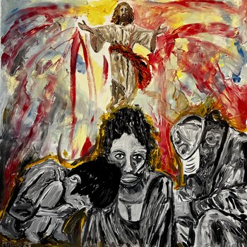 In mijn werk probeer ik emotionele intensiteit en passie vast te leggen door het gedurfde gebruik van kleur en figuratieve representatie. Dit zijn technieken die kenmerkend zijn voor het fauvisme. Dit schilderij verbeeldt een moment van spirituele en menselijke openbaring, waarbij de figuren met emotionele kracht tevoorschijn komen. Het symboliseert bijna een innerlijke zoektocht naar verlossing en begrip. Elke penseelstreek is een uitdrukking van… hoop, pijn en vernieuwing, bedoeld om reflectie en dialoog op te wekken bij de kijker.