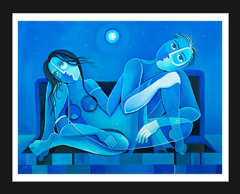 Bij het maken van dit schilderij wilde ik de diepe band tussen twee individuen verkennen, gehuld in een zee van diepblauw die zowel de rust als de intensiteit van hun emoties symboliseert. Door kubisme te gebruiken om hun vormen te fragmenteren en fauvisme om de levendige energie van kleur te ontketenen, wilde ik de complexiteit van menselijke relaties vastleggen. Dit kunstwerk spreekt niet alleen tot de zielvolle diepten waarin we duiken met degenen… van wie we houden, maar verkwikt ook elke ruimte met zijn dynamische en gepassioneerde tinten.