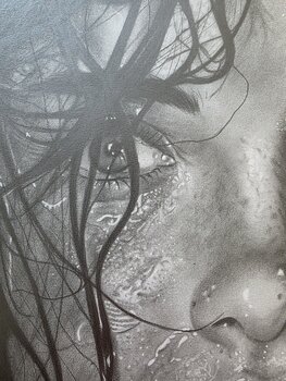 Ik vond de referentieafbeelding voor deze tekening op Pinterest. Ik bleef meteen staan toen ik die expressieve ogen zag. Ik wilde die foto direct gebruiken als basis voor mijn hyperrealistische werk.