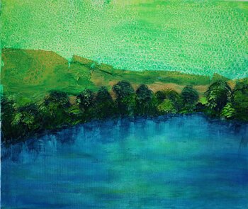 In dit werk probeerde ik de rustige essentie van de ochtend vast te leggen, waar tinten groen en blauw harmonieus samenvloeien en de sereniteit van de natuur weerspiegelen. Met behulp van acryl onderzocht ik een rijke, semi-abstracte textuur om een landschap op te roepen waarin elk element trilt met een kalmerende energie. Dit schilderij is een uitnodiging om de rust en schoonheid van elke nieuwe dag te omarmen.