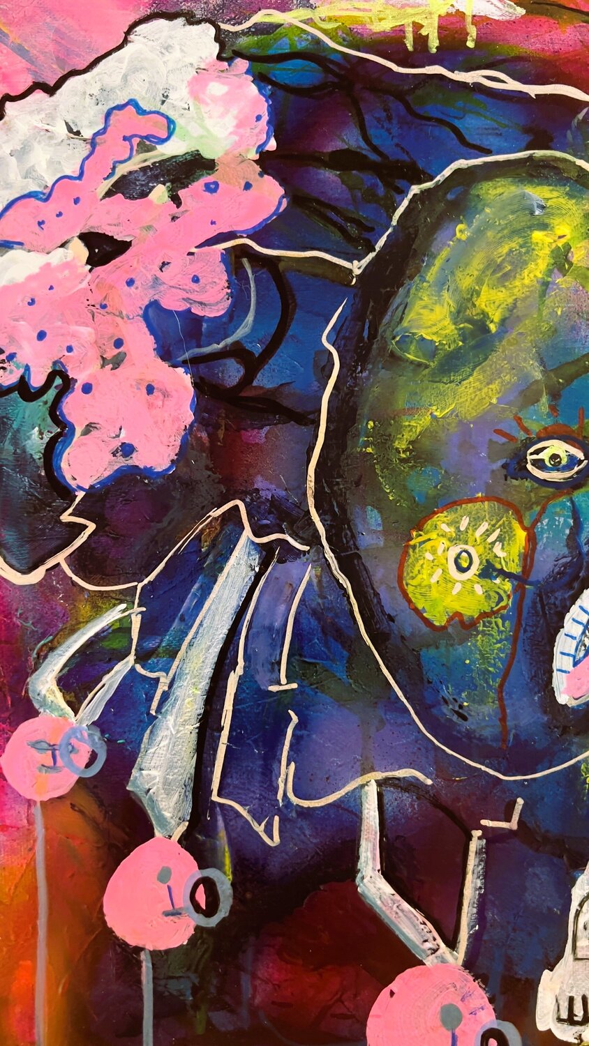 Ze creëert zonder vaste richting en laat zich leiden door het doek, totdat zich een onverwachte balans of gecontroleerde chaos voordoet. Deze intuïtieve, bijna meditatieve benadering resulteert in werken zonder turbulentie, maar geladen met emoties, stilte en verborgen betekenissen.