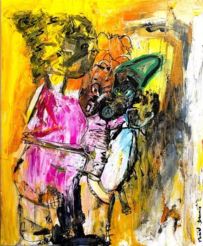 In het gedurfde werk getiteld "La Pousseuse d'Horizon" nodigt de kunstenaar ons uit voor een meditatie over de dynamiek van invloed en mentorschap. De compositie baadt in een oceaan van zonnig geel en schemerig oranje, waar roze accenten een vitaliteit injecteren die lijkt te kloppen op het ritme van het leven zelf.
