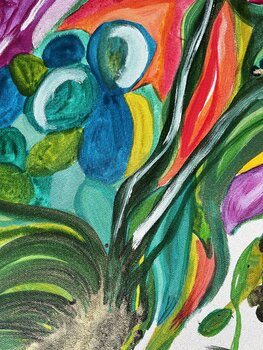 Ze creëert zonder vaste richting en laat zich leiden door het doek, totdat zich een onverwachte balans of gecontroleerde chaos voordoet. Deze intuïtieve, bijna meditatieve benadering resulteert in werken zonder turbulentie, maar geladen met emoties, stilte en verborgen betekenissen.