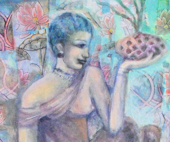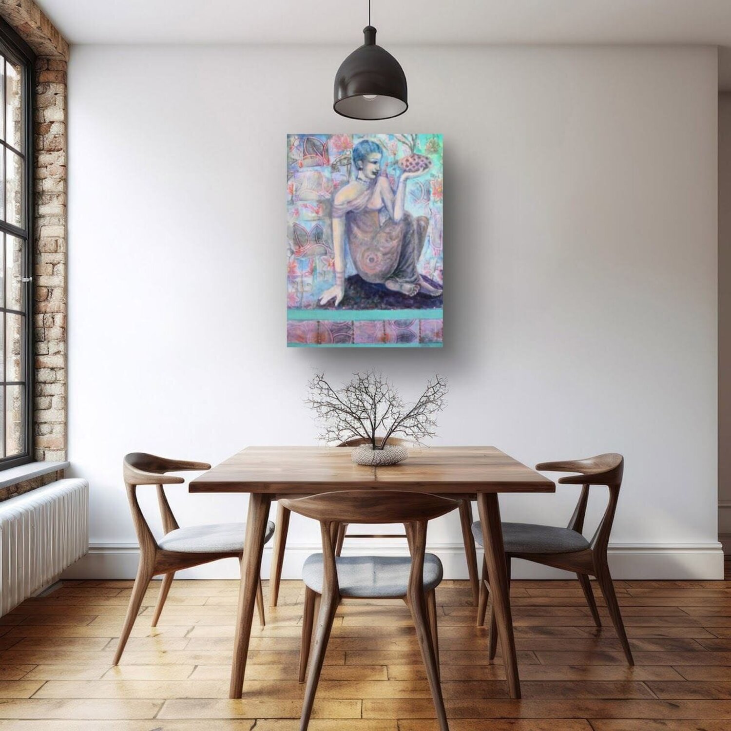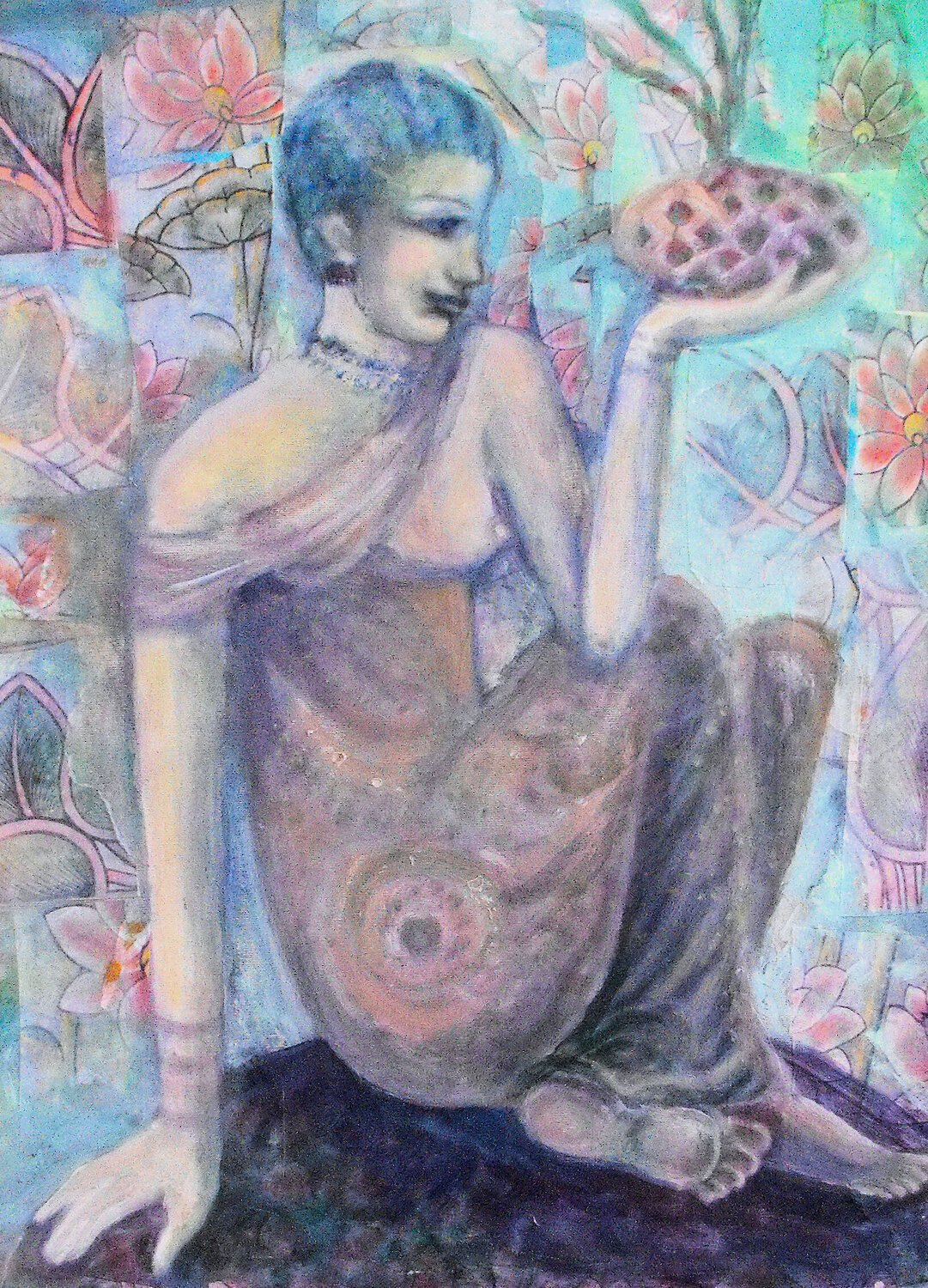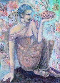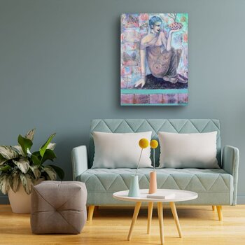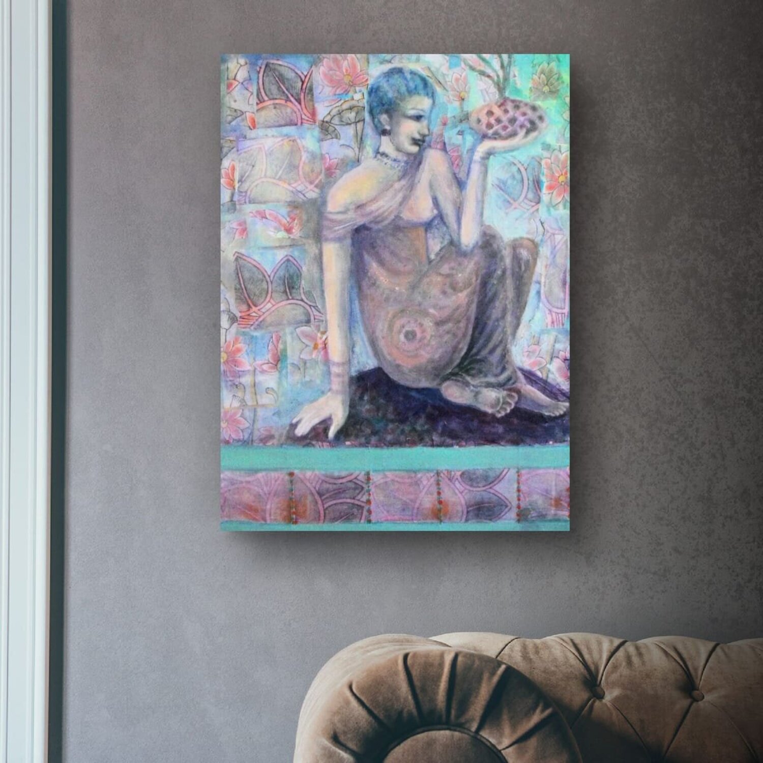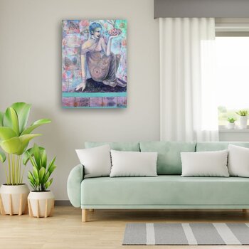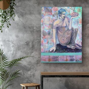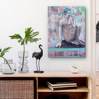 Bij het maken van dit werk verdiepte ik me in een fusie van expressionisme en oosterse kunst, waarbij ik acrylverf en collage gebruikte om een symbolisch verhaal te creëren. De figuur, in contemplatie te midden van door de natuur geïnspireerde patronen, belichaamt rust en verlichting. Dit schilderij nodigt kijkers uit in een serene, bijna mystieke ruimte, waar elk element zingt over erfgoed en de diepere zoektochten van de ziel. Het is ontworpen… om een vredige maar diepgaande energie in elk huis te brengen, en een gevoel van harmonie en diepe reflectie op te roepen. Het schilderij is geïnspireerd op oude muurschilderingen. De figuur is doordacht en sereen. De vloeiende bloemencollageontwerpen zijn afgeleid van oosterse textiel.