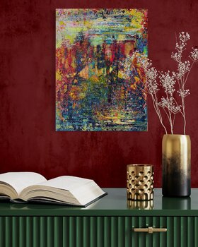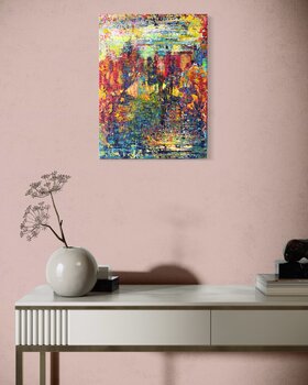 "Herfsthelderheid" is een levendige, rijk gelaagde abstracte compositie uit de serie "Het seizoen van de ziel", geïnspireerd op het citaat van Friedrich Nietzsche: "Ik merk dat de herfst meer het seizoen van de ziel is dan van de natuur." Het kunstwerk legt een moment van intense emotie vast, waarin kleur en beweging samenkomen in een dynamisch, meeslepend geheel. De wisselwerking tussen heldere kleuren en dichte texturen roept een landschap in beweging… op – een emotioneel terrein gevormd door energie, herinnering en seizoensgebonden transformatie. In plaats van een specifieke plek af te beelden, nodigt het werk de kijker uit om de sensatie van overvloed en verandering te ervaren, en weerspiegelt het de levendigheid en diepte van de herfst op zijn hoogtepunt.