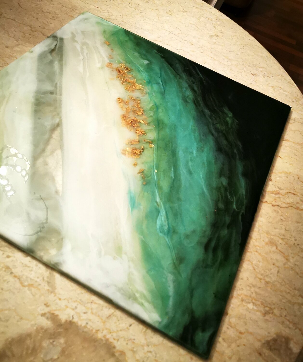 Verschillende lagen groenachtige hars en witte golven doen denken aan een andere zee en een strook transparante epoxyhars onthult de originele textuur van het glas en enige transparantie.