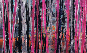 Modern abstract schilderij met veel dynamische motregen in roze, zilver, indigo over kobaltblauw. Gesigneerd vooraan.