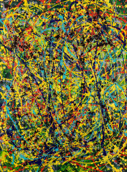 Expressionistisch abstract schilderij met groenblauw, blauw, geel, iriserende heldere verf, zwart, groen en veel irisatie. Voltooid met gebaren en energie. Kan in meerdere richtingen worden weergegeven. Gesigneerd op de achterkant of voorkant op aanvraag.