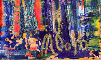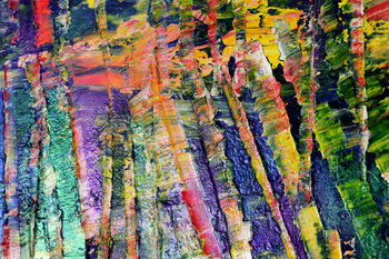 Dit kunstwerk is gemaakt in lagen en vermenging van dikke lagen van vele kleuren, aangevuld met iriserende effecten in paars, blauw en groen.