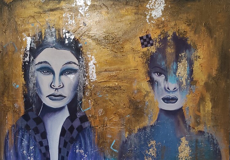 In dit werk onderzocht ik de texturen en contrasten tussen de concreetheid van cement en de luxe van bladgoud en -zilver. De spanning tussen abstractie en figuratie manifesteert zich in de gezichten, die bijna als surrealistische verschijningen tevoorschijn komen uit een tumultueuze achtergrond. Elk detail is een dialoog over identiteit en metamorfose, en nodigt de kijker uit om na te denken over zijn of haar eigen masker in de kunst en het leven.… De energie van dit schilderij zou elke ruimte transformeren en een vleugje mysterie en diepe reflectie toevoegen.