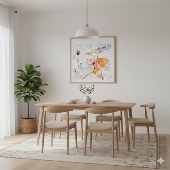 Delicate tekstfragmenten, levendige kleurspatten en transparante lagen aquarel geven "Garuda" lichtheid en beweging. Een werk dat zowel bescherming als vrijheid viert – als een gevleugelde verbinding tussen hemel en aarde.
