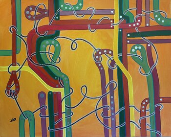 In dit kunstwerk heb ik krachtige acrylkleuren gebruikt om abstracte vormen te weven die over het canvas dansen, waardoor een levendig samenspel van lijnen en vormen ontstaat. De touwen, weergegeven met grillige rondingen en verfraaid met stippen, symboliseren verbindingen en de verwevenheid van levenspaden. Levendig groen en warme sinaasappelen doordrenken het stuk met energie en optimisme. Het thuis tentoonstellen van dit schilderij kan een dagelijkse… herinnering zijn aan de levendige complexiteit van het leven en de schoonheid van onderlinge verbondenheid.