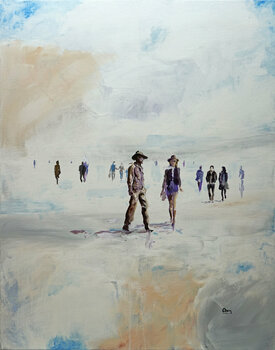 Acryl en gesso op canvas. Fantasiescène van mensen die door de hemel lopen. Ik keer terug naar mijn oude serie wandelingen in de lucht. Mijn inspiratie is het Licht en de Rust in een atmosfeer zonder enig materieel element.