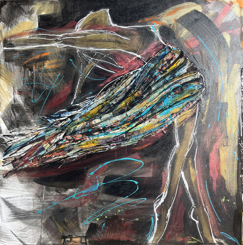In dit werk wilde ik een moment van spanning en beweging vastleggen, als een mentale voorbereiding op een grote sprong. De lagen acrylverf en collage creëren een levendige textuur, terwijl de epoxy op de rok de diepte en het licht versterkt. Dit vrije kunstwerk nodigt je uit om de rauwe energie en de ambiguïteit van emoties te voelen en brengt een krachtige dynamiek in je ruimte.