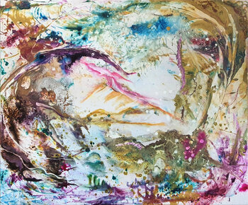 Dit schilderij brengt je in een vredige bui. Laat je blik dwalen en voel de energie. Het beeld is abstract gehouden, maar doet denken aan een landschap. Donker violet, stralend turkoois en een gouden oker toon domineren het werk. De lichte open ruimtes geven diepte en maken het schilderij licht en los. De kunst van Petra Heck ontstaat in een soort action-painting-proces. Het canvas ligt op de grond en de verf wordt gelopen en bespat. Met grootse… gebaren (hier wordt soms een bezem gebruikt) verdeelt de kunstenaar de kleuren op het doek. Een dynamisch en energiek werk. Na het drogen begint een rustigere fase. Het doek wordt gedraaid en gedraaid, details komen naar voren en gebieden die niet coherent lijken, worden bedekt. Zo ontstaan in de loop van de tijd deze bijzondere werken, waar je gewoon blij van wordt.