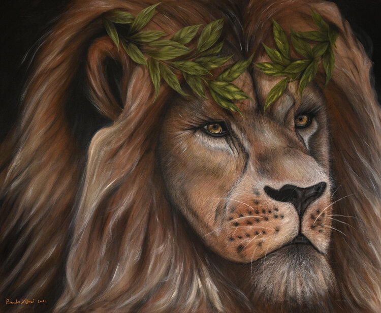 In dit krachtige schilderij kunnen we een leeuw observeren, de koning der koningen en het symbool van de vereniging van de leeuw. Zijn kenmerken omvatten de kracht en taaiheid van royalty's. Met een subtiele blik draagt hij een lauwerkrans, een symbool dat al sinds mensenheugenis door keizers en koningen wordt gedragen.