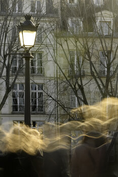 Parijs, Pont Marie, midden in de middag. De gebouwen op de achtergrond staan aan de Quai de Bourbon. Ik kijk recht in de zon. De lantaarnpaal wordt alleen door de zon verlicht; het lijkt wel zijn eigen lichtbron, als een daglamp. De sluitertijd is zo ingesteld dat wanneer blonde vrouwen door het beeld lopen, hun haar gouden golven vormt. Deze golven contrasteren, door hun beweging en horizontaliteit, met de etalage en de hoogte van de lantaarnpaal.… Hun kleur vindt echter een echo, zij het een zwakke, in de "blonde" steen van het gebouw aan de rechterkant.