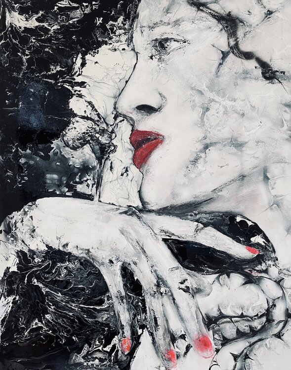 In dit schilderij combineer ik lak en spuitverf om een krachtig beeld te creëren tegen een vloeiende achtergrond. Geïnspireerd door strips en expressionisme, beeld ik een vrouw af die gevangen zit in de spanning tussen het moment en de eeuwigheid. De contrasterende zwart-witte tinten benadrukken haar introspectieve gemoedstoestand, terwijl haar rode lippen en nagels de sensualiteit en passie van dit moment onderstrepen.