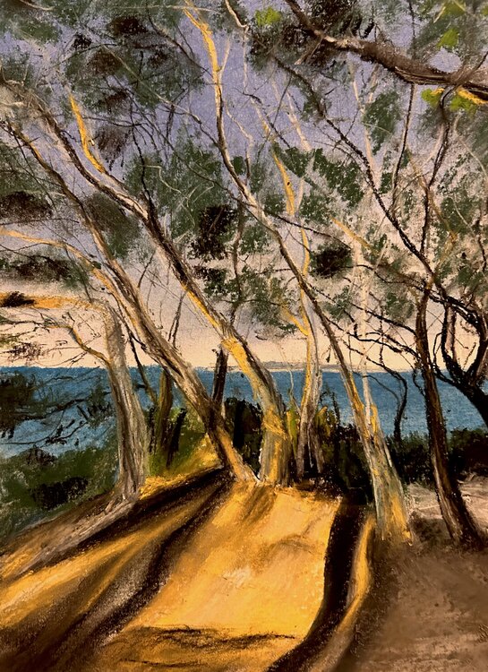 In dit werk heb ik de zachte energie van een vroege ochtend vastgelegd met pastelkrijt en krijt. De delicate takken suggereren een subtiele beweging, terwijl het warme ochtendlicht hoop en rust uitstraalt. Het nodigt je uit om de natuur te ervaren in haar stille ontwaken – een harmonieus samenspel van licht en schaduw bij Punta Licosa dat een levendige warmte in huis brengt. Serie: Passeggiata a Punta Licosa - Cilento, Italië