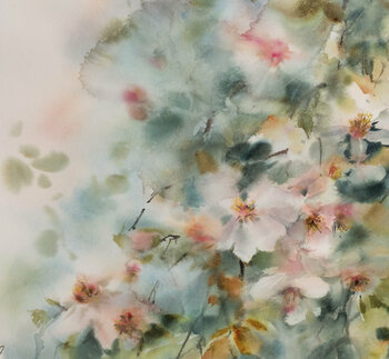 Als de lente begint is de eerste bloeiende boom Amandel en dit symboliseert eigenlijk de komst van de lente. Sophie schildert elk lenteseizoen amandelbloei en dit schilderij is van de lente van 2018.