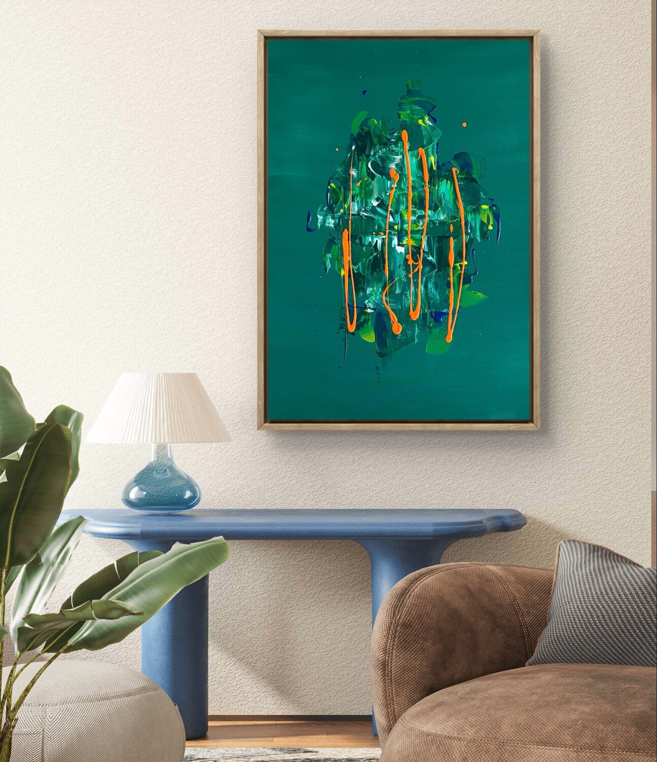 Dit werk is ontstaan vanuit een verlangen om de spanning tussen rust en energie te verkennen. Ik heb acryl gebruikt om levendige contrasten te creëren: het diepgroene staat voor sereniteit, terwijl de oranje strepen de vitaliteit symboliseren die de stilte verbreekt. Ik wil dat dit werk een dynamische balans uitstraalt en een intense maar ontspannende energie brengt in de ruimtes waar het wordt tentoongesteld.