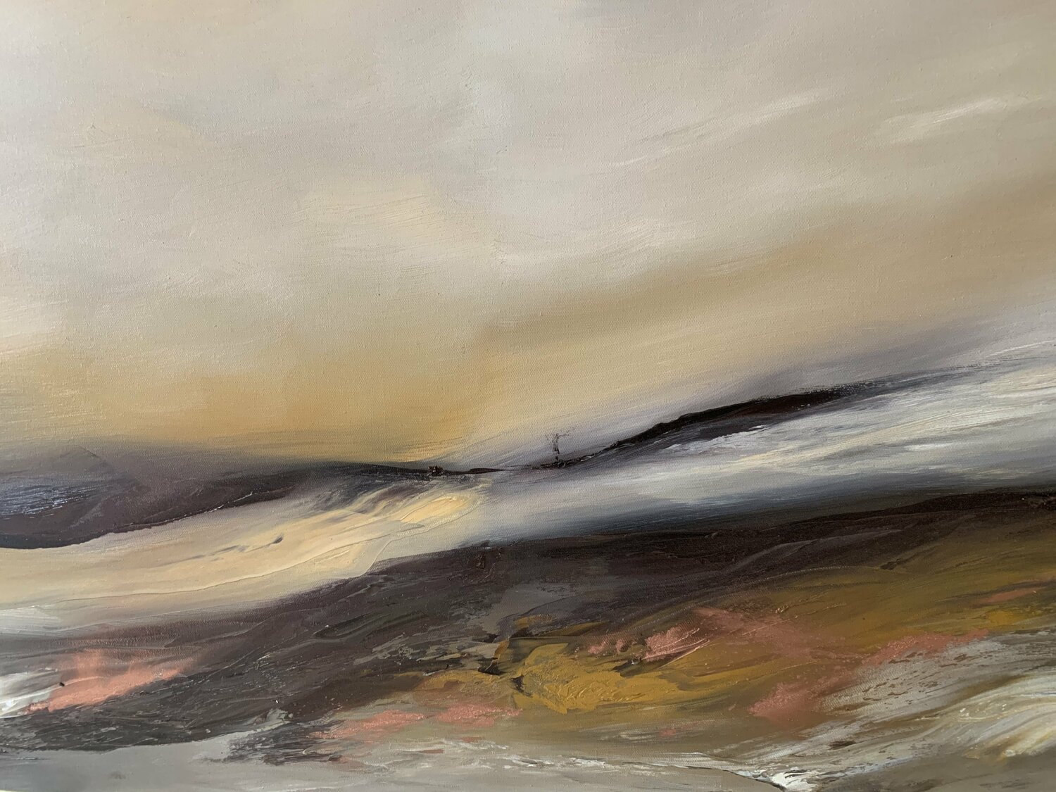 Geïnspireerd door de uitgestrekte oceaan die me omringt en de schoonheid die mijn aandacht trekt. Kunstwerk gemaakt met warme tinten en een vleugje bronzen pigment.