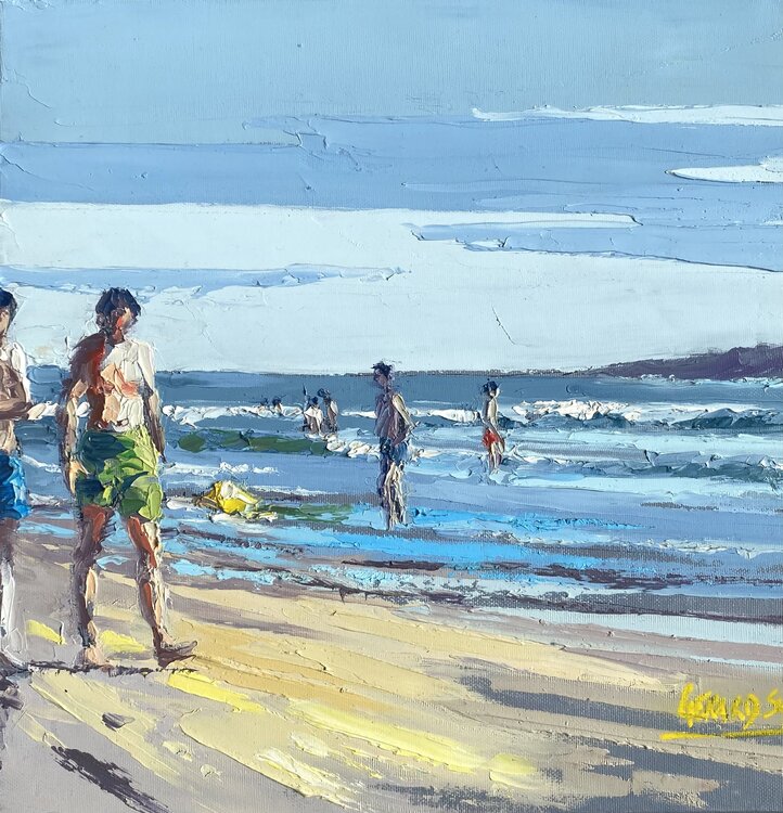 Ik wilde de frisheid en lichtheid van een zomerdag op het strand vastleggen. Met behulp van de rijke textuur van olieverf en de paletmestechniek breng ik de golven en figuren tot leven, wat een gevoel van vrijheid en puur geluk oproept. Deze scène brengt een verkwikkende energie, perfect om je huis op te vrolijken en te ontspannen.