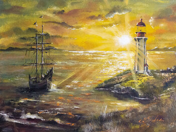 Ik hou van de zee. De kleuren van dit schilderij zijn fantastisch. Gele en oranje wolken laten zien dat het avond is, tijd om te ontspannen en de onvergetelijke zonsondergang te ervaren.