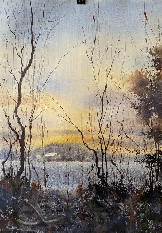 In dit schilderij probeerde ik de serene, contemplatieve sfeer van een winterochtend vast te leggen. Met delicate aquarelstreken bracht ik de fragiele schoonheid van kale takken tegen een zacht gloeiende hemel over. De impressionistische stijl nodigt de kijker uit om de stilte en subtiele warmte te voelen die in de koude lucht hangt, en brengt een zachte, vredige energie in elke ruimte waar het hangt.